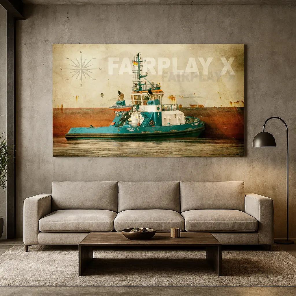 Im Hintergrund ist die rostige Bordwand eines Frachtschiffs zu sehen, die die Dimensionen und Herausforderungen der Schlepperarbeit unterstreicht. Die eingearbeitete Kompassrose und der Schriftzug "FAIRPLAY X" verleihen dem Bild einen besonderen maritimen Charme und machen es zu einem Hingucker für jeden Hafenliebhaber.